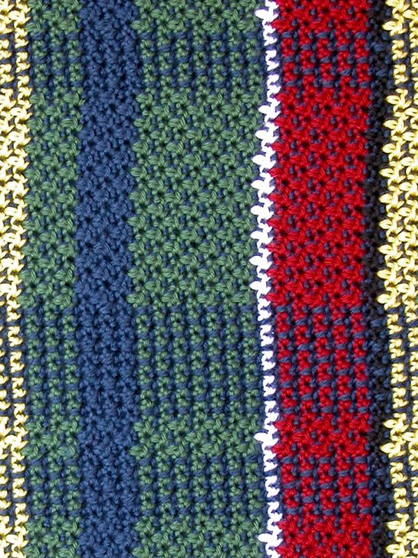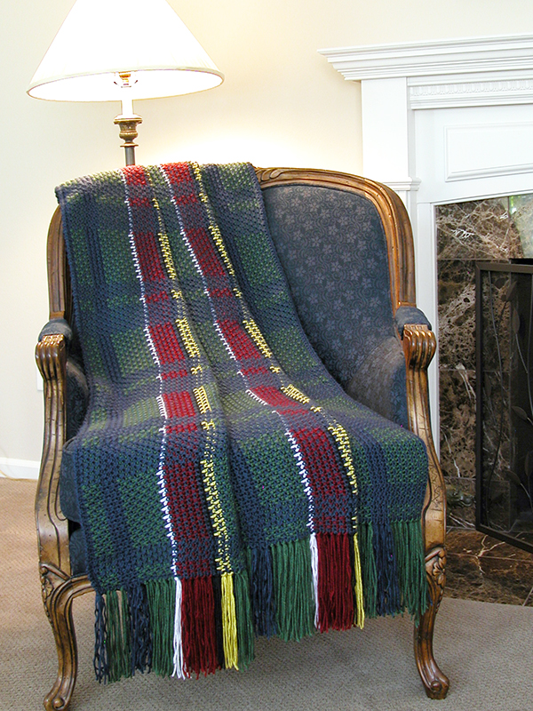Warm up your holidays with the bright Christmas colors of this reversible afghan. This reversible technique alternates rows of blue with green, red, white, black and yellow to create this plaid design. It's not as complicated as it looks (check out the Free Patterns page for patterns to try out this technique)!