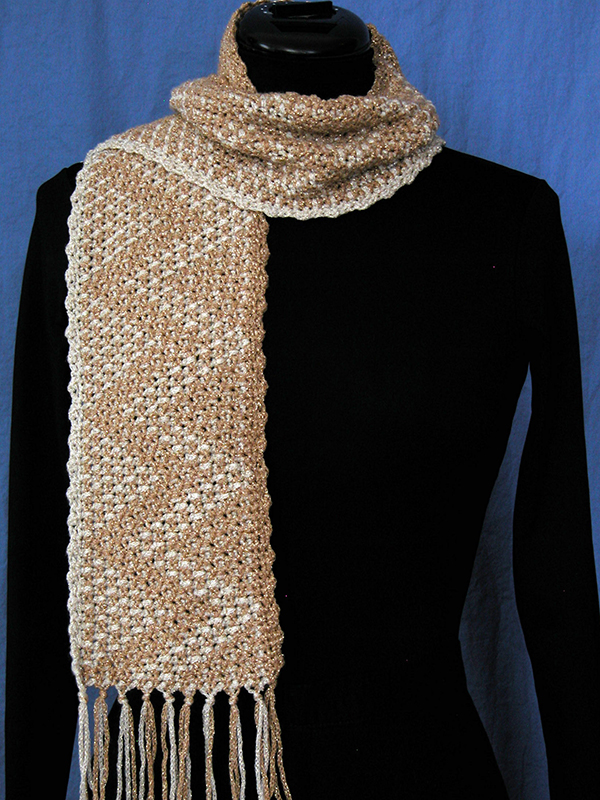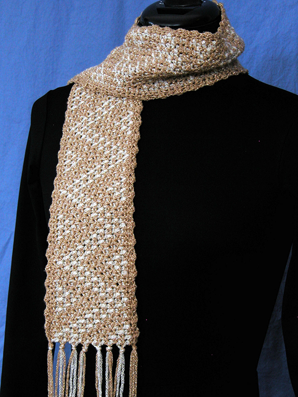 Bundle up for the cold weather with these sparkling reversible zigzag-design scarves. The small scarf has even stripes of gold and cream; the zigzag design on the large scarf graduates from cream on one side to gold on the other. This reversible technique makes one color more prominent on each side. It is not as complicated as it looks (check out the Free Patterns page for patterns to try out this technique)!